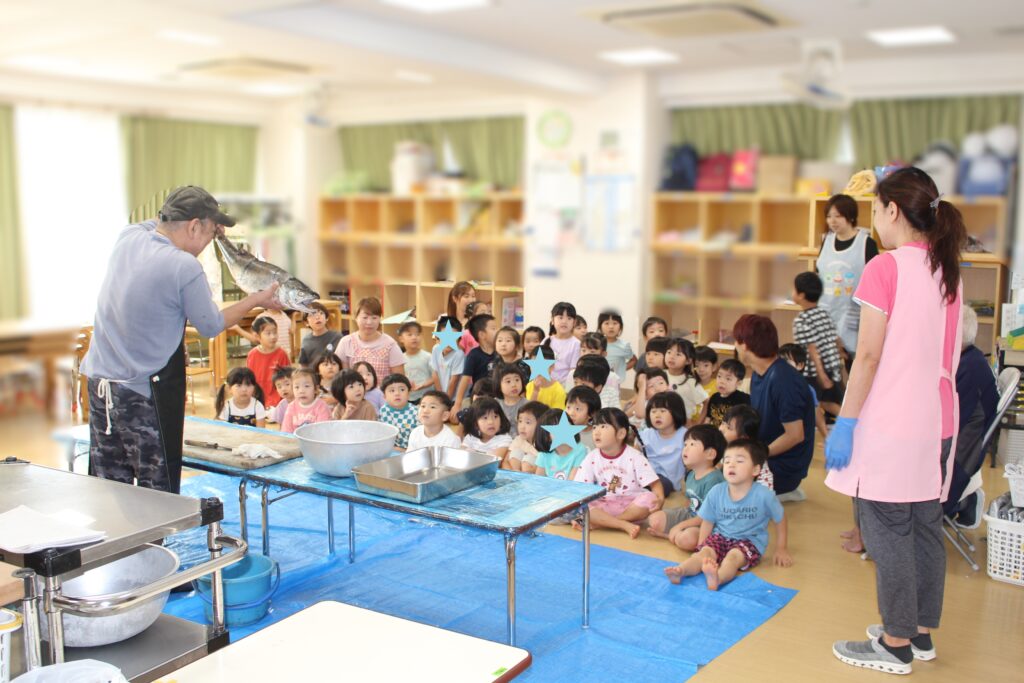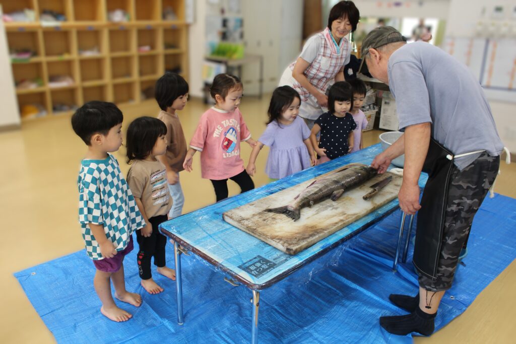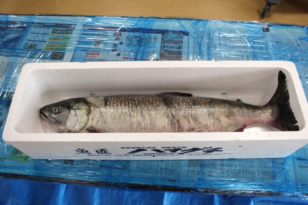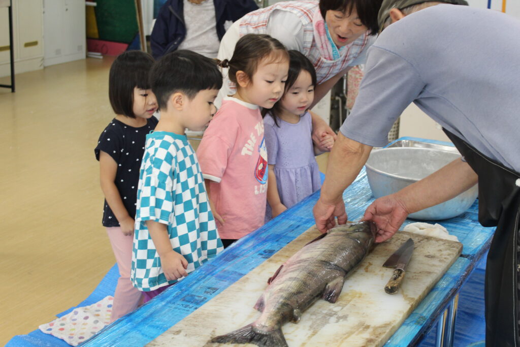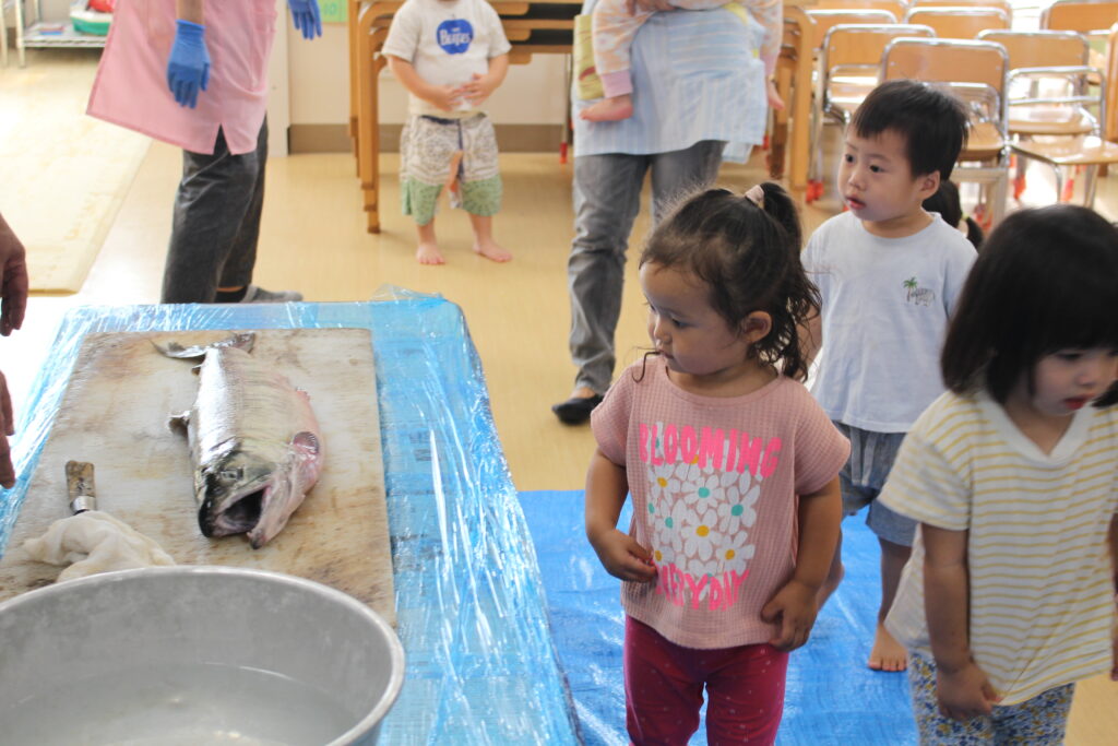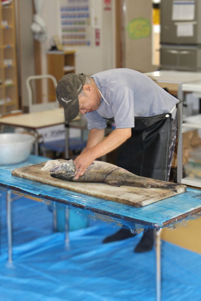 今年もいつもお世話になっているお魚屋さんに来ていただき、鮭の解体ショーを行いました。