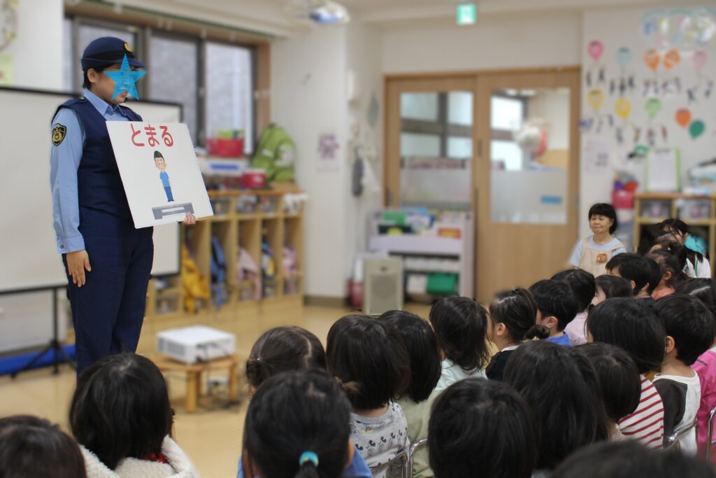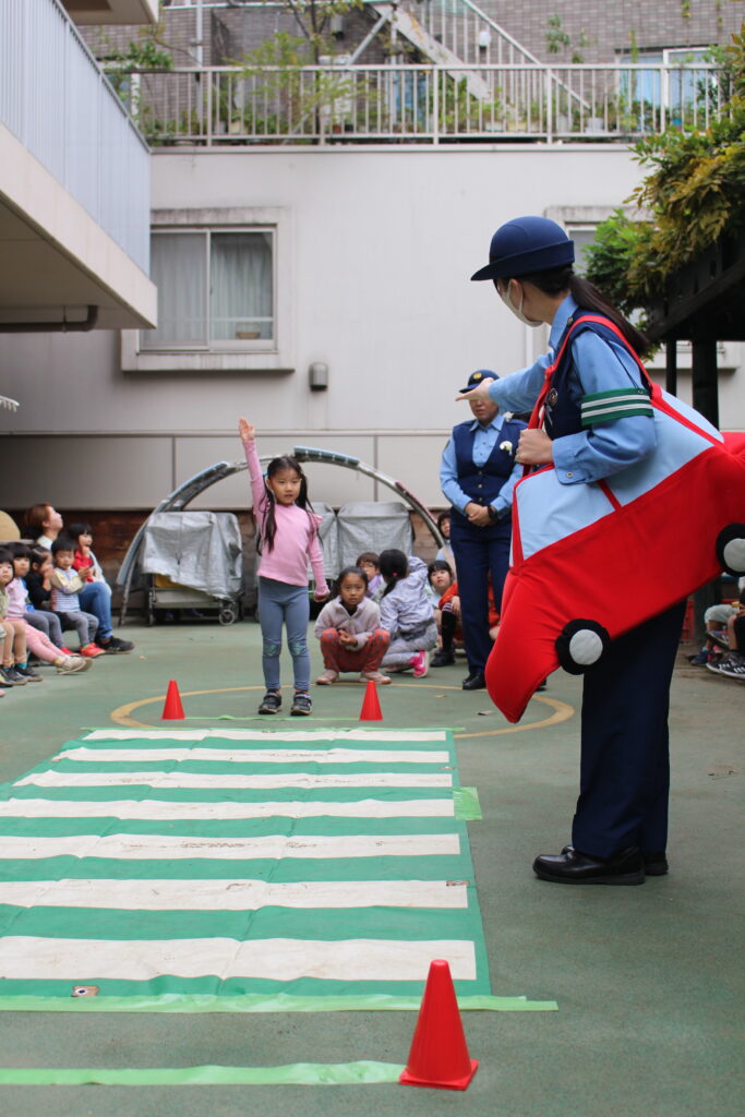 まずは交通ルールのお約束の話がありました。おまわりさんの質問に元気に答えたり、知っていることを一生懸命お話しする子どもたちでした!