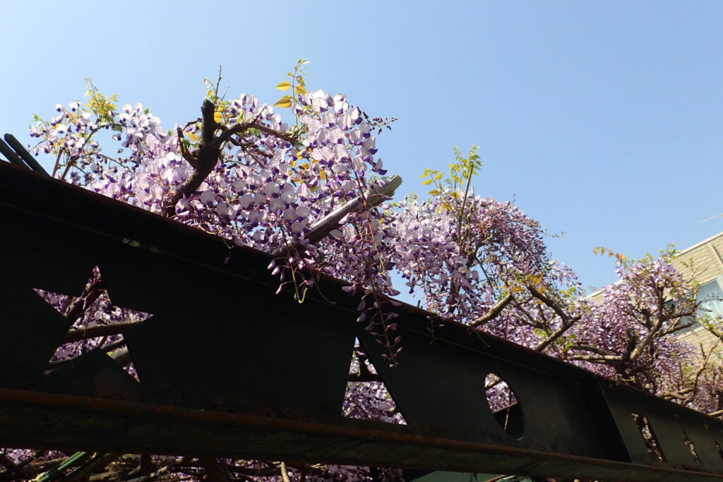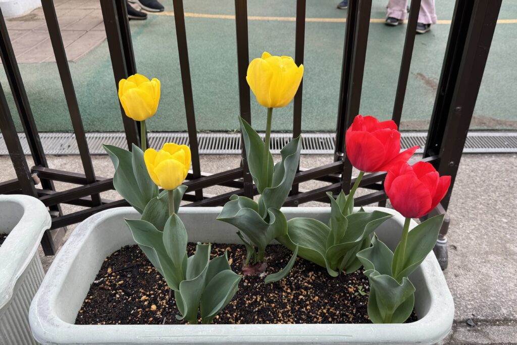 年長児が昨年球根を植えたチューリップが綺麗に咲き、園庭には藤の花がまもなく満開を迎えます。