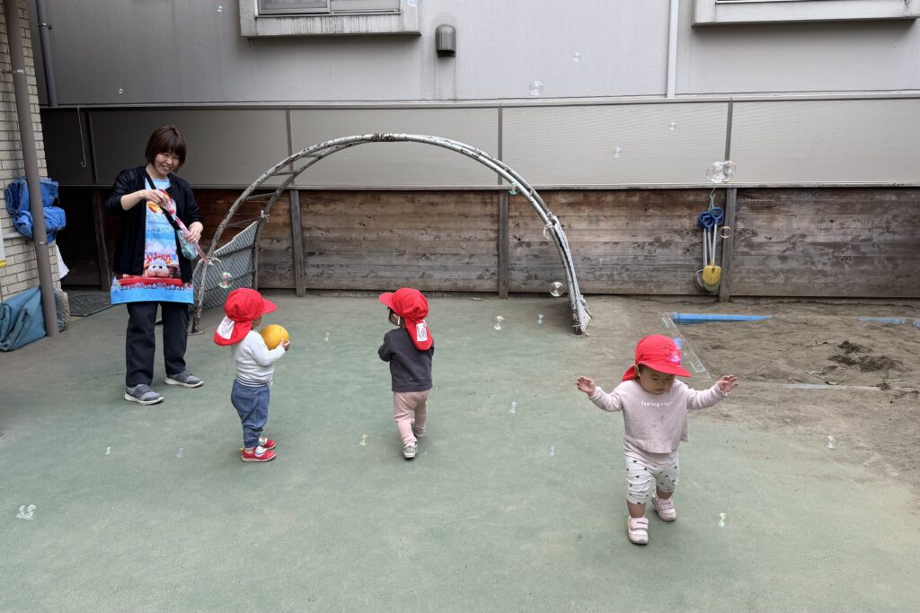 シャボン玉を追いかけて楽しむ1歳児さん♪