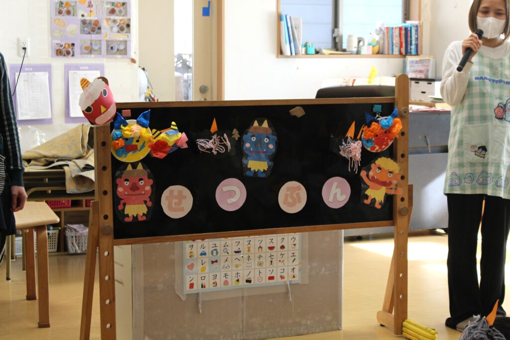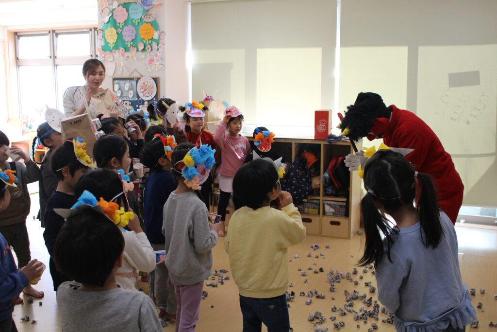会の後は豆まきです。お面つけて…