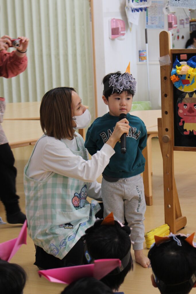 「おにはそと~!ふくはうち~!」とかけ声の練習です。