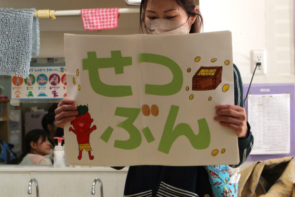 恵方巻の話に興味津々だった子どもたち。今年の方角を知っている年長さんが「なんなんとう!」と教えてくれました。「すごい、知ってるの?」と先生たちびっくり!