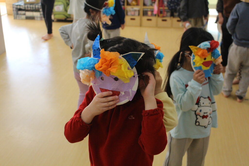 手作りの鬼のお面をかぶって参加する子どもたちもいます♪