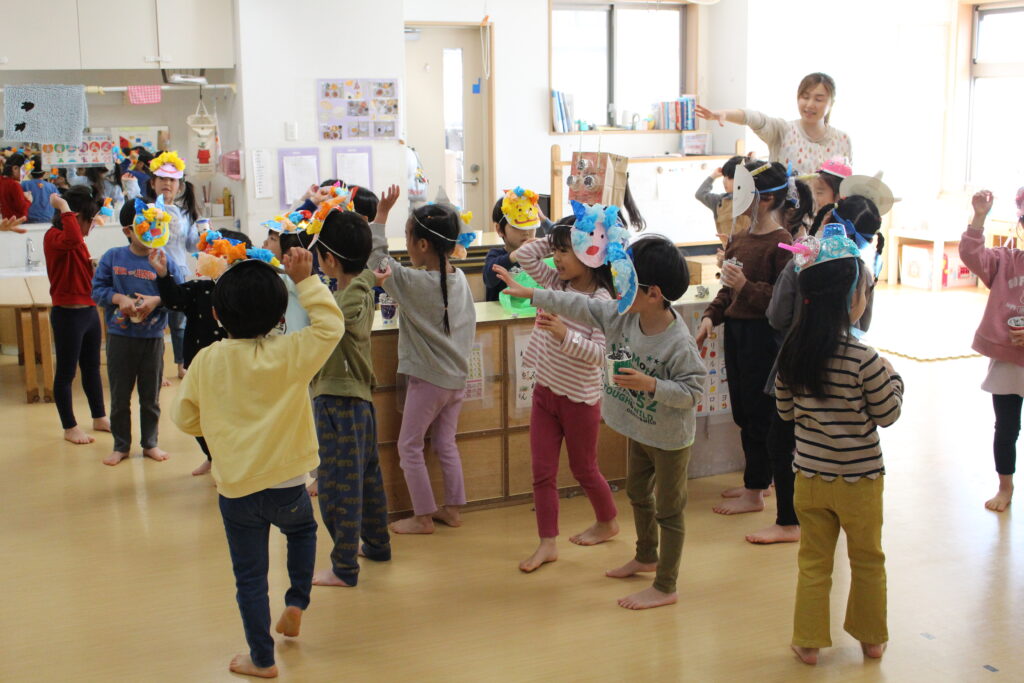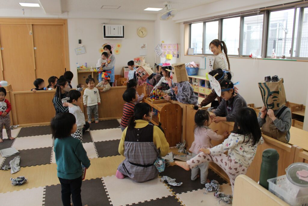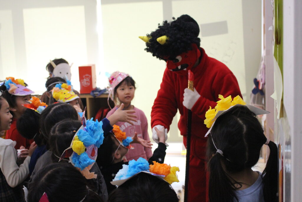東が丘保育園では日本文化の伝承を大切に考え、日本行事のひとつとして例年通りの豆まきを行っています。怖がらせる目的ではなく「年の変わり目に邪気を払い一年の無病息災を願う」という意味や由来を子どもたちに伝えることを大切に、楽しんで豆まきを行えるよう配慮しています。鬼とは必ず仲直りしてお別れをします。怖くて離れていた子どもたちも、最後には自ら握手をしに行っていました。