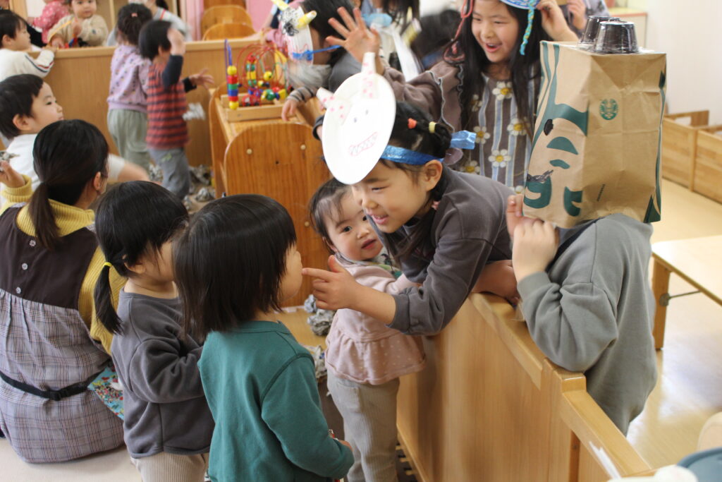0,1歳児クラスには年長児が鬼となって登場!ズラリと並んだ小鬼たちに興味津々で近づいていきます。